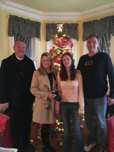 At last year’s Goshen Christmas House Tour, Father George Hafemann (left), Church of St. John the Evangelist and Catholic Charities board member, blessed the Orange Avenue home of the Toohey family who generously included their house on the Tour. Pictured with Fr. George for the blessing are the homeowners Sheila, Shannon, and Tim Toohey.